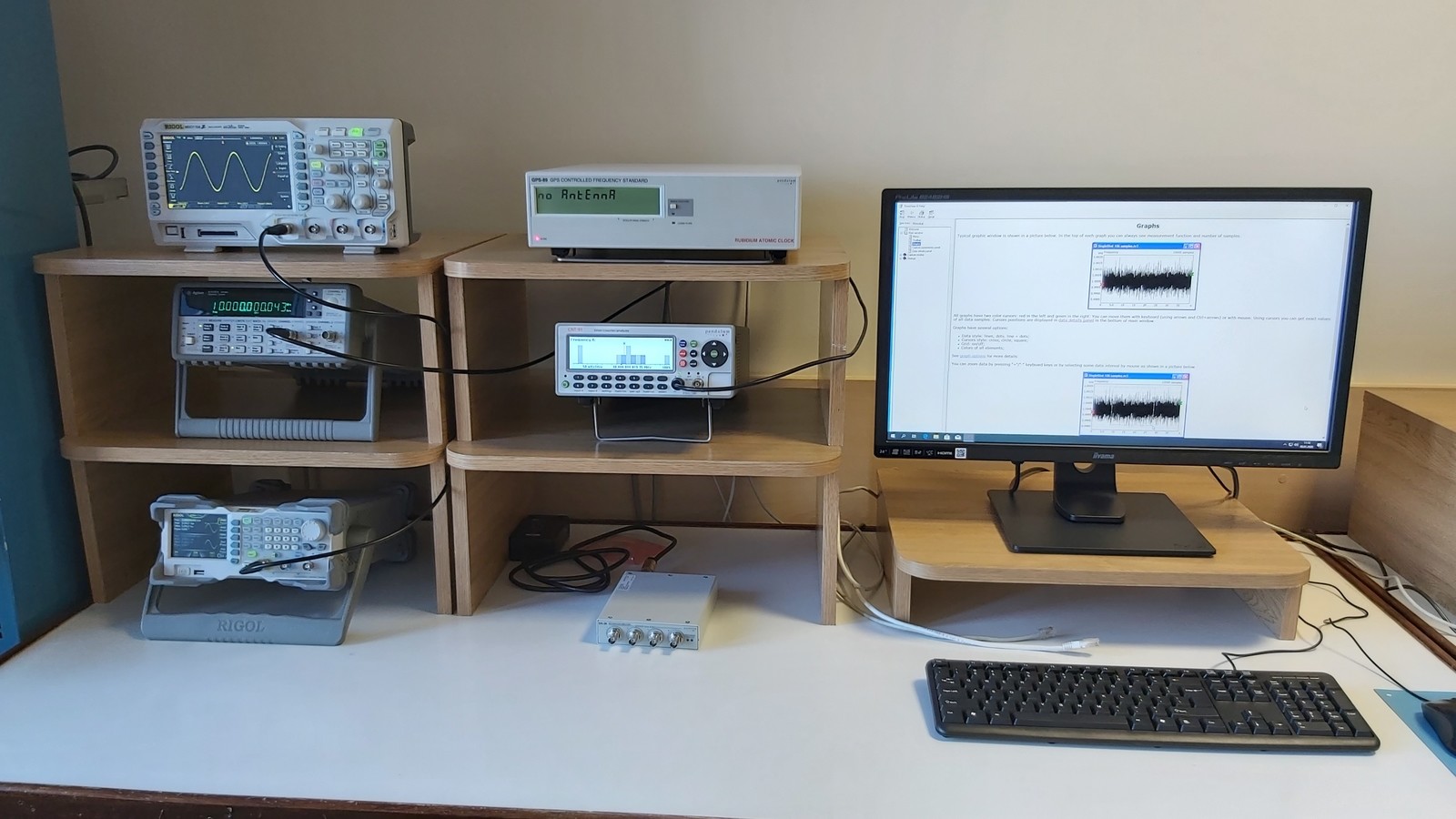 W zakończonym w 2019r pierwszym etapie przygotowania do akredytacji uruchomione zostało stanowisko do wzorcowania częstościomierzy, czasomierzy i generatorów. Główną częścią tego stanowiska jest zestaw referencyjnego częstościomierza, składający się z rubidowego atomowego wzorca częstotliwości dyscyplinowanego sygnałem GPS, analizatora czasu i częstotliwości wyposażonego w kwarcowy generator podstawy czasu pracujący ze stabilizacją temperatury oraz wzmacniacza dystrybucyjnego. Rubidowy wzorzec częstotliwości posiada kilka wyjść częstotliwości wzorcowej 10 MHz, dlatego może być wykorzystany nie tylko jako zewnętrzne źródło sygnału podstawy czasu dla analizatora czasu i częstotliwości, ale także jako źródło sygnału referencyjnego dla innych przyrządów działających w laboratorium lub poza nim. Jedno z wyjść wzmacniacza dystrybucyjnego umożliwia przesłanie referencyjnego sygnału 10 MHz za pomocą światłowodu na odległość do 2 km.